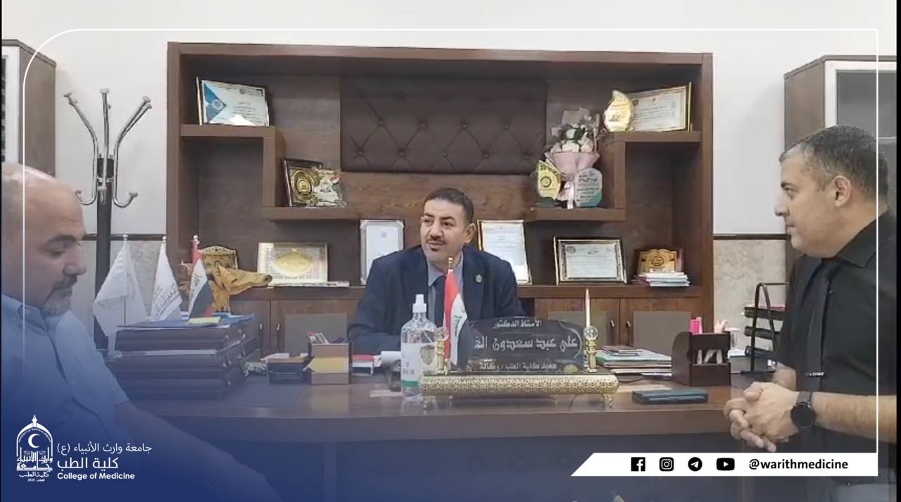 The Dean of the Faculty of Medicine at the University of Warith al-Anbiya (peace be upon him) received Professor Dr. Ali Abd Saadoun al-Ghazi, the respected Dr. Maad Nassif Jassim, a consultant to the British Royal College, where a presentation was made about the possibility of establishing a center for emergency and disaster medicine in cooperation with the British Royal College and opening channels of cooperation between the Royal British College and the University of Warith al-Anbiya. (A) Where the delegation was briefed on the infrastructure and human resources at the university.