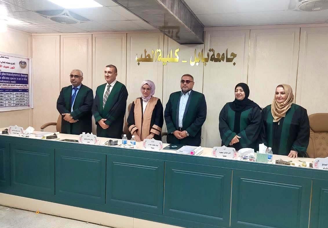 Assistant Professor Dr. Laith Muhammad Abbas, Assistant Dean for Scientific Affairs at the College of Medicine, University of Warith Al-Anbiya, participated on Monday 9/2/2024 as a chairman in the discussion committee for the master's student (Nour Abdul Wahid Abboud) at the College of Medicine, University of Babylon, entitled: (Evaluation of pharmacokinetic and pharmacodynamic changes of some antifungal agents against Candida albicans species in the pharmacokinetic/pharmacodynamic model in the laboratory)