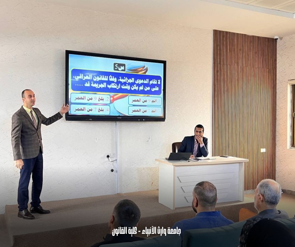 As Part of Enhancing Scientific Engagement and Developing Students’ Academic Skills, the College of Law Recently Organized a Scientific Competition in Criminal Law The event was conducted under the supervision and presentation of Assist. Prof. Dr. Ahmed Jabir and Dr. Hussein Taj. The competition was marked by the outstanding participation of students who demonstrated a high level of understanding and analytical ability in the field, contributing to a vibrant academic atmosphere filled with constructive competition.The event also witnessed broad academic and student attendance, providing an opportunity for the exchange of ideas and perspectives among all participants.