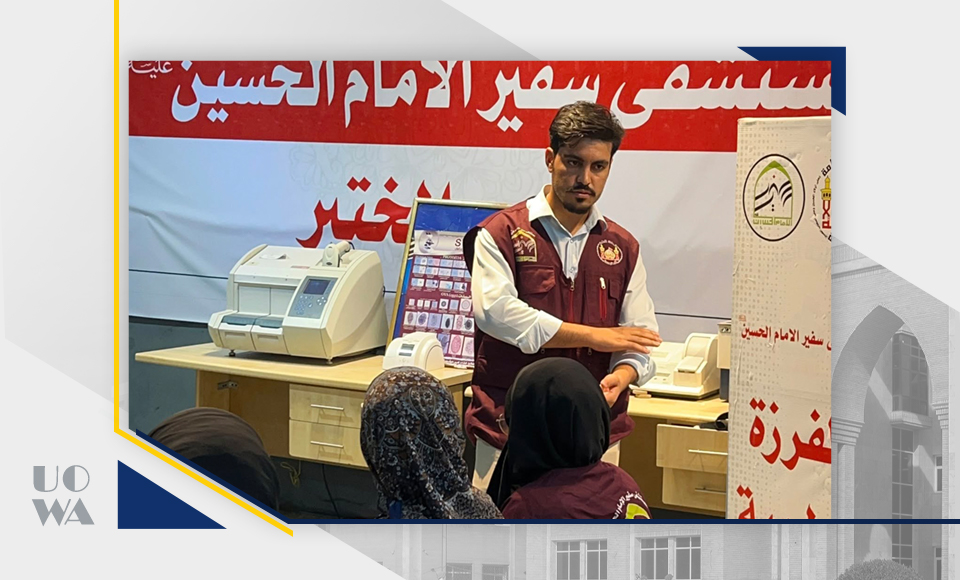 A number of medical students from the University of Warith al-Anbiya (peace be upon him) participated as part of the medical cadres in the specialized detachments of the Ambassador of Imam Hussein (peace be upon him) Hospital, to provide health services and first aid to the visitors of Imam Hussein and Abu al-Fadl al-Abbas (peace be upon them), during the flag-changing ceremony on the first of Muharram.