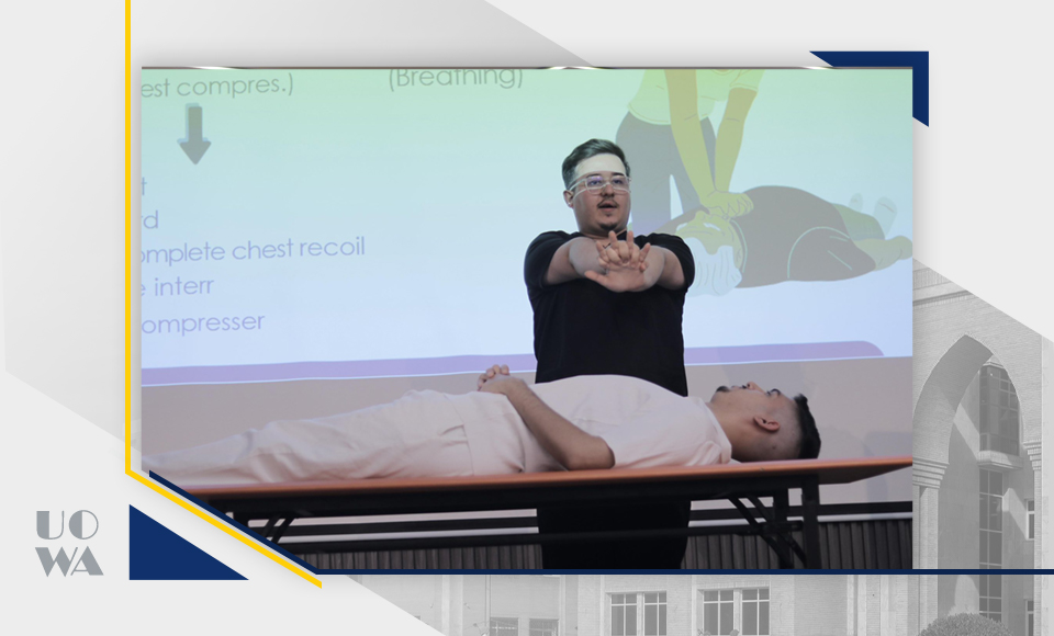 Muhammad Ali Al-Mousawi, a sixth-year student from the College of Medicine at Warith Al-Anbiya University (peace be upon him), delivered a Basic Life Support (BLS) first aid training workshop to a group of students from various medical colleges. The workshop was hosted by the Ministry of Youth and Sports - Scientific Care Department, and attended by the Deputy Minister of Youth and Sports. The workshop included training participants on the basics of cardiopulmonary resuscitation (CPR) and emergency response, and was met with great interaction from attendees who praised the level of preparation and presentation.