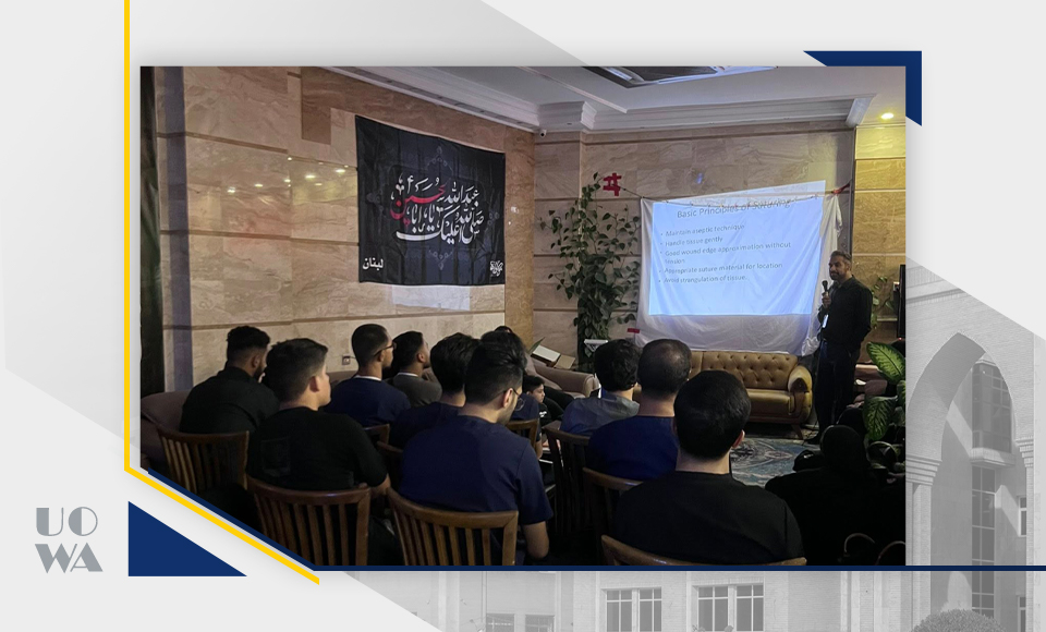 In an atmosphere of giving and service, and to ensure their readiness to provide the best medical services in the field during the Arbaeen pilgrimage of Imam Hussein, peace be upon him, part of a series of training workshops for students of the College of Medicine at the University of the Prophets’ Successor, organized by the International Imamate Organization (IMI), a practical workshop entitled Suturing Skills, presented by Dr. Mudussar from the United States of America.