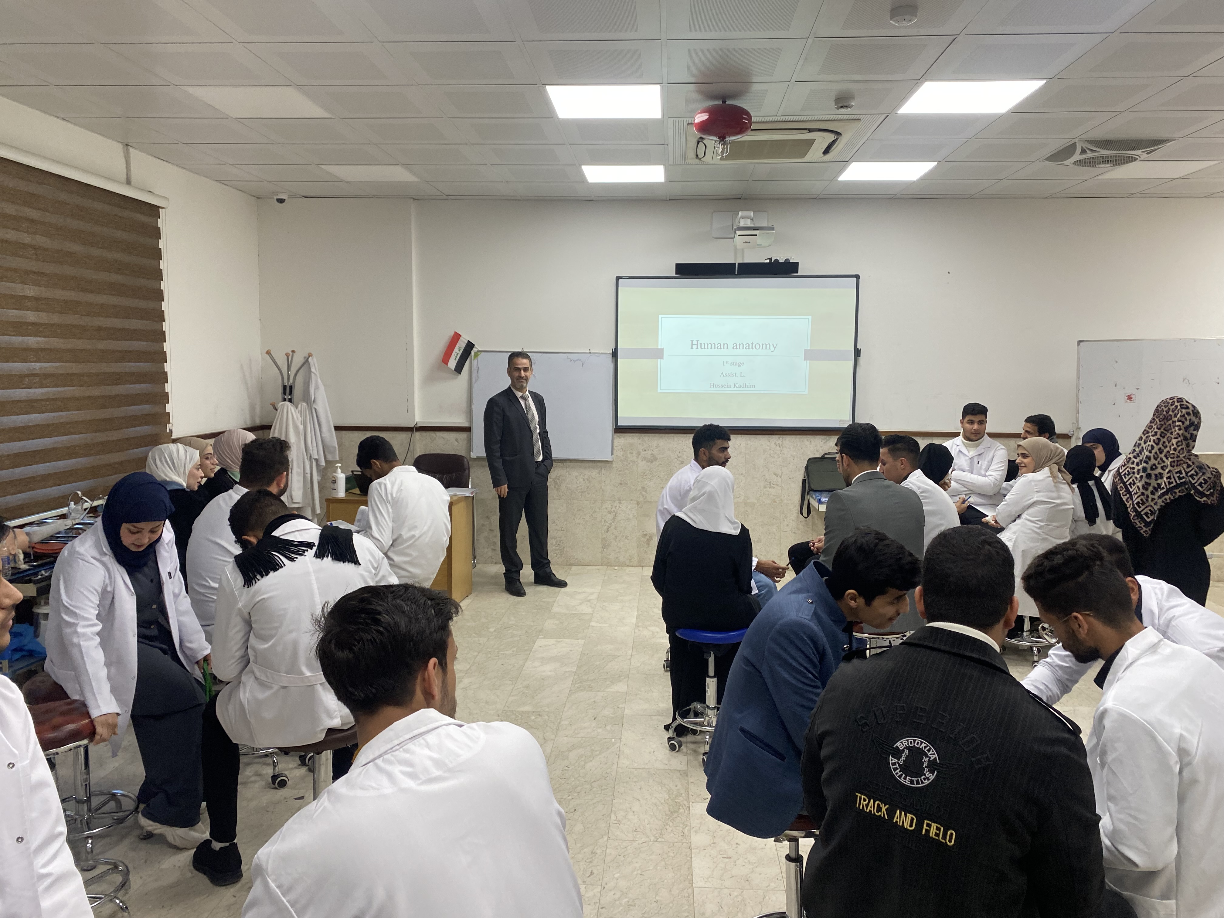 In the presence of Assistant Professor Dr. Nassim Samir Saqr, Assistant Dean of the College of Nursing, to review the progress of the educational process and to ensure the quality of the practical lessons that students receive in the educational laboratories, and to train the students in small groups, develop their skills in the subject of practical anatomy, and qualify them to perform in the College of Nursing Champions Competition, which will be held on 2/27/ 2024