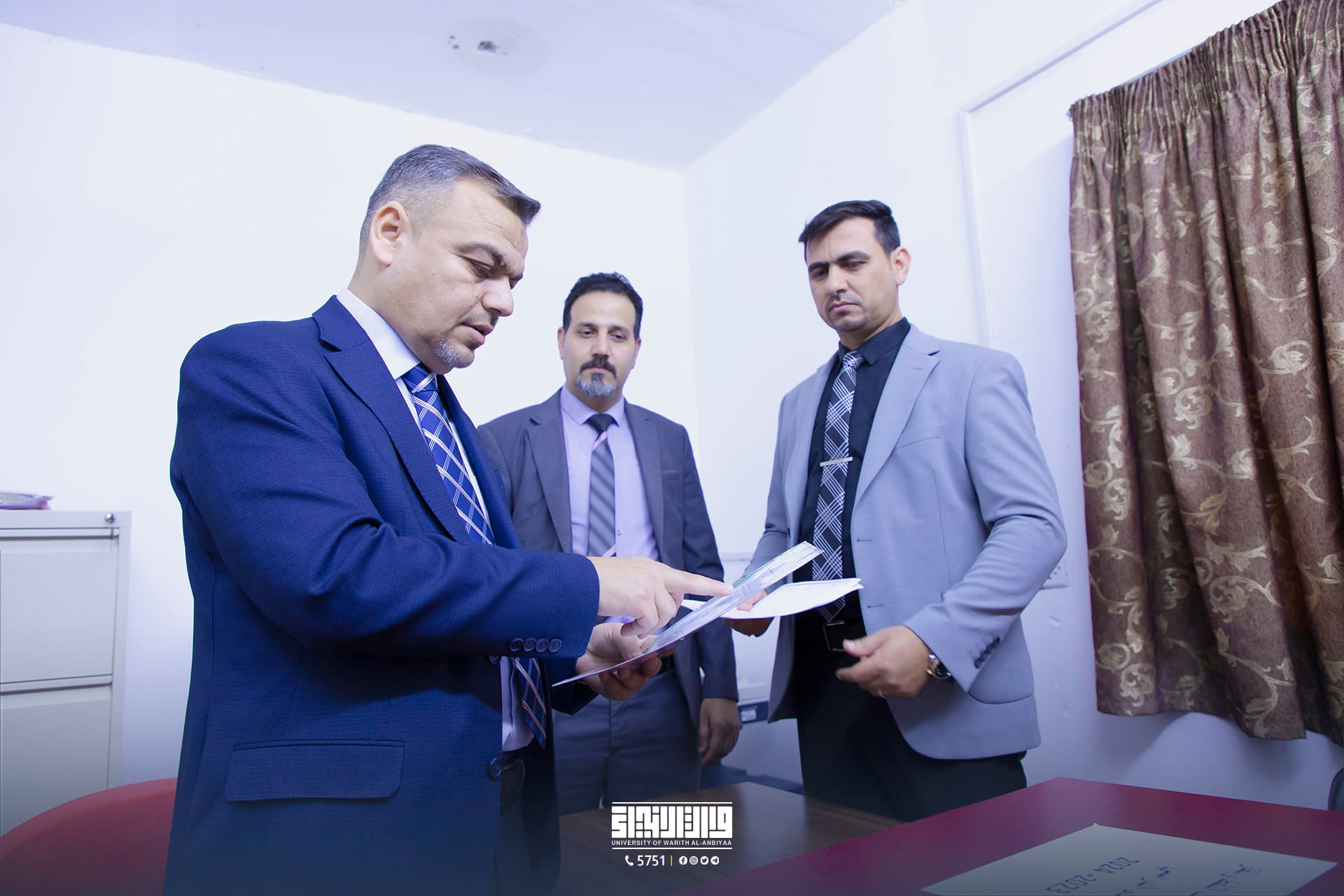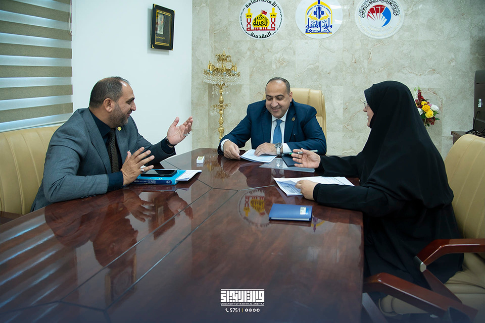 The University of Warith Al-Anbiyaa (PBUH) hosted a meeting between the presidents of the three universities affiliated with the Holy Shrine of Imam Hussain. Professor Dr. Ibrahim Saeed Al-Hayawi, the President of the University of Warith Al-Anbiyaa (PBUH), welcomed Professor Dr. Zainab Al-Sultani, the President of Al-Zahra University (PBUH) for Girls, and Professor Dr. Abbas Al-Daami, the President of the Technical Education Authority.