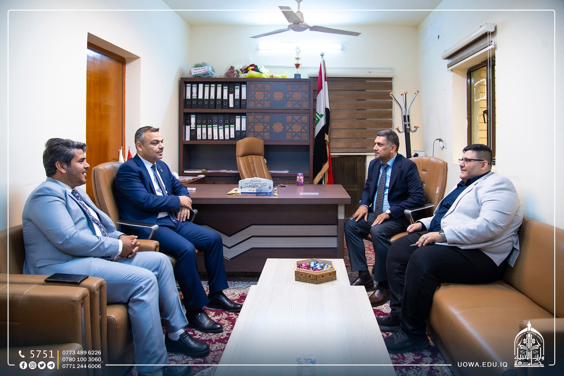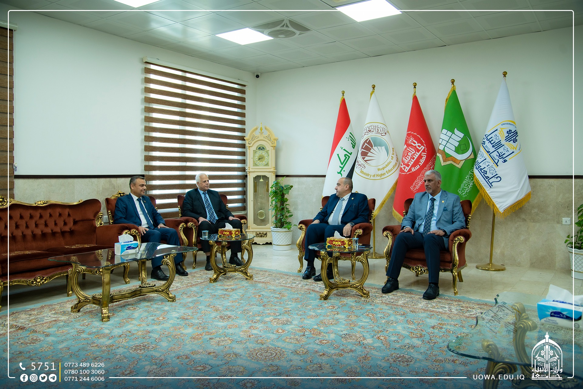 The President of the University, Professor Dr. Ibrahim Al-Hayawi, received the President of the University of Karbala, Professor Dr. Basim Khalil Al-Saadi, along with the Administrative Assistant, Professor Dr. Akram Al-Yasiri, who visited the university to offer congratulations to Professor Dr. Waqad Al-Mousawi on the occasion of his appointment as the Assistant President of the University for Scientific Affairs. They prayed to Allah, the Almighty, for his continued success in the path of knowledge and his service to our beloved country.