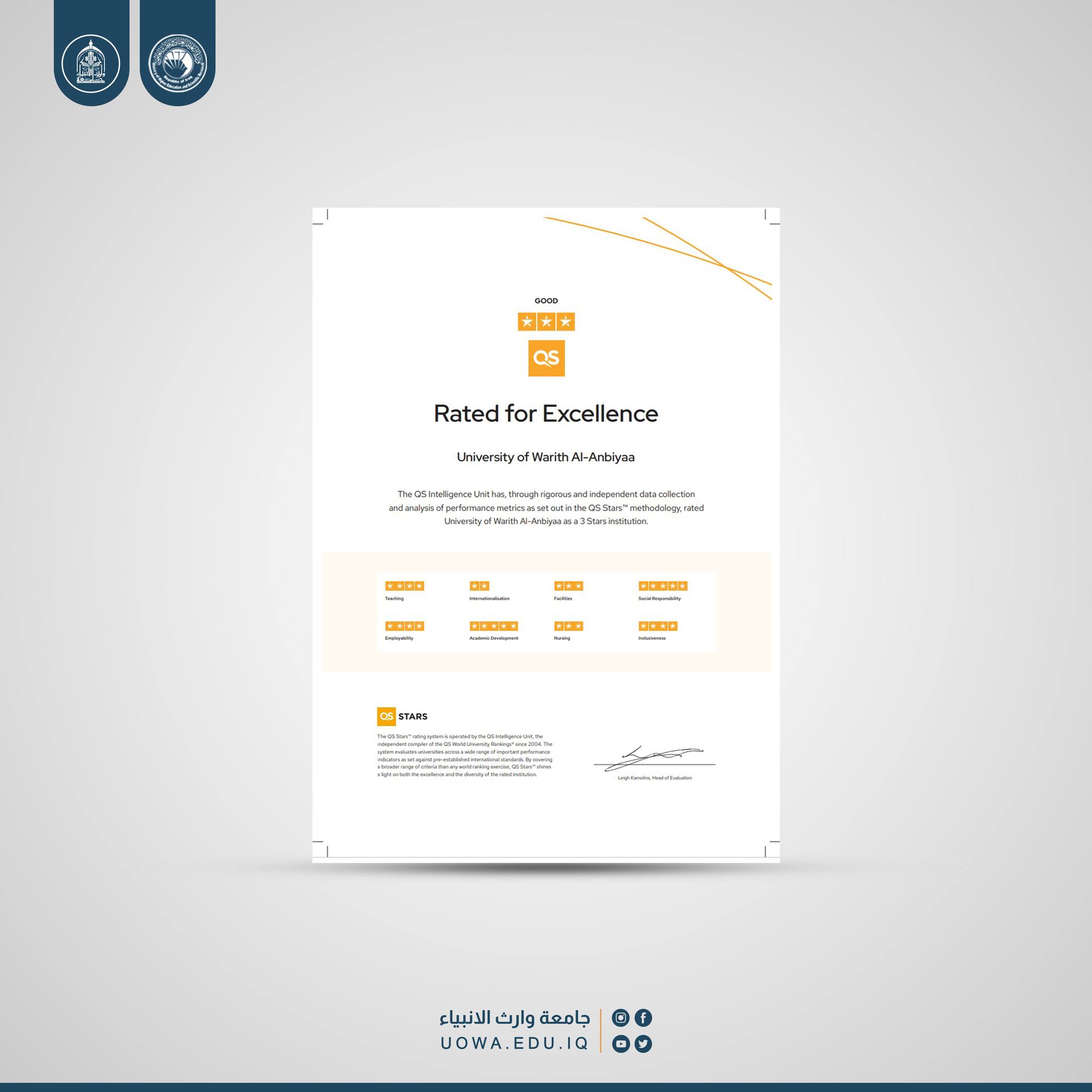 The University of Warith Al-Anbiyaa (peace be upon him) received a three-star rating from the British QS Stars evaluation system after an evaluation period that extended for more than eight months. The university achieved exceptional results in various aspects, most notably: